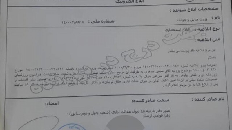 شعبه ۴۵ دیوان عدالت اداری در متن حکم صادره به تاریخ ۳۰ خرداد ۱۴۰۰ نیز آورده است: «... بموجب ماده ۳۵ قانون تشکیلات و آیین دادرسی دیوان عدالت اداری... قرار توقف عملیات اجرایی صدور ابلاغ ریاست فدراسیون زورخانهای به نام مهرعلی باران چشمه، موضوع انتخابات ۱۹ خرداد ۱۴۰۰ تا تعیین تکلیف نهایی در دیوان صادر میگردد... کلیه سازمانها تابعه پس از ابلاغ دستور موقت مکلف به اجرای سریع و کامل مفاد آن میباشند. متخلف یا متخلفان از اجرای این دستور به انفصال از خدمت به مدت ۶ ماه تا یکسال و جبران خسارات وارده محکوم خواهند شد. قرار صادره قطعی و غیرقابل اعتراض است».